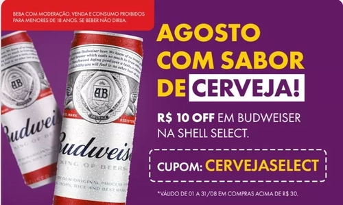 R$10 OFF acima de R$30 na Budweiser com cupom Shell