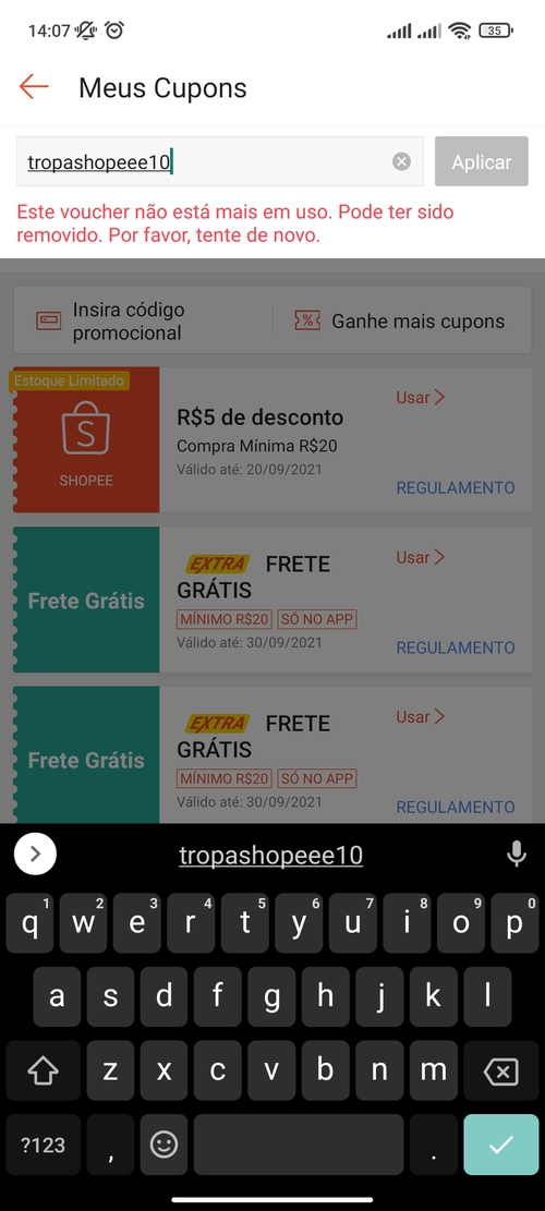 O cupom tá errado, é "Shopee" com dois "e" só. Coloquei com três e deu que o cupom era inválido; botei só dois e foi.