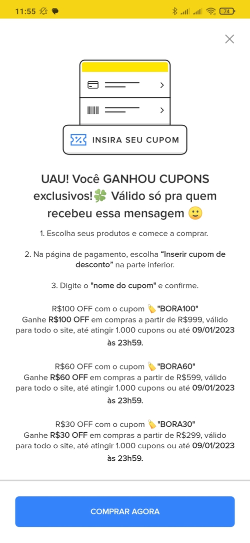 Aqui diz que já ADICIONEI o cupom, sendo que não utilizei e nem aparece o desconto!
