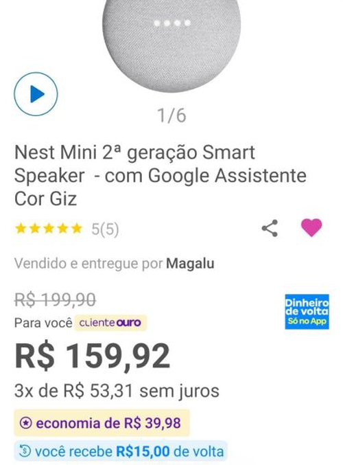 [R$145 MagaluPay+C. Ouro] Nest Mini 2ª geração | R$160