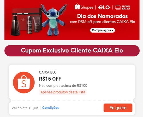 R$15 OFF EM COMPRAS ACIMA DE R$100, EM PAGAMENTOS VIA CARTÃO CAIXA ELO/SHOPEE