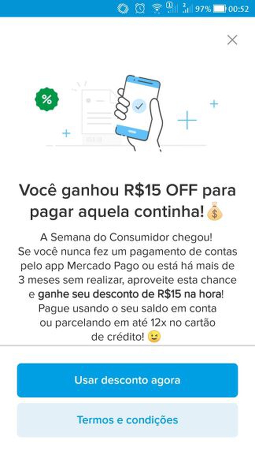 Simulei um pagamento de conta de luz e não apareceu o desconto de R$15,00, então não finalizei o pagamento.