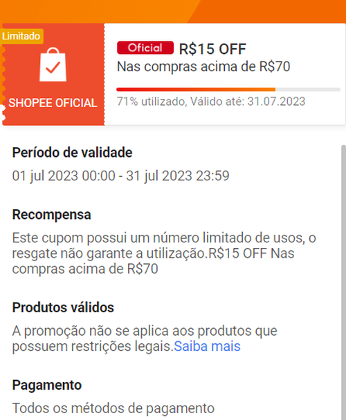 R$15 OFF nas compras acima de R$70 em lojas oficiais Shopee