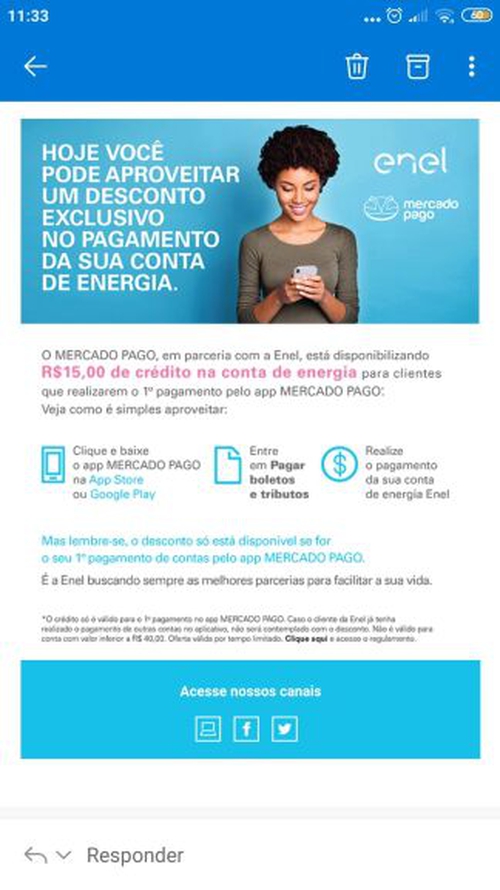 R$ 15 reais de crédito na conta de energia
