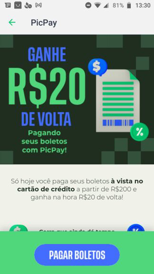 R$20 de volta pagando boleto acima de R$200 em 1x no crédito