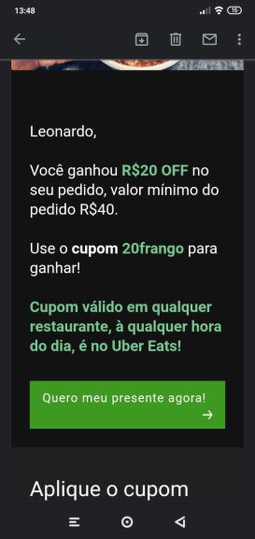 R$20 OFF no seu pedido, valor mínimo do pedido R$40.
