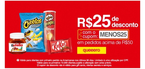 R$25 de desconto em compras acima de R$50 com cupom Americanas