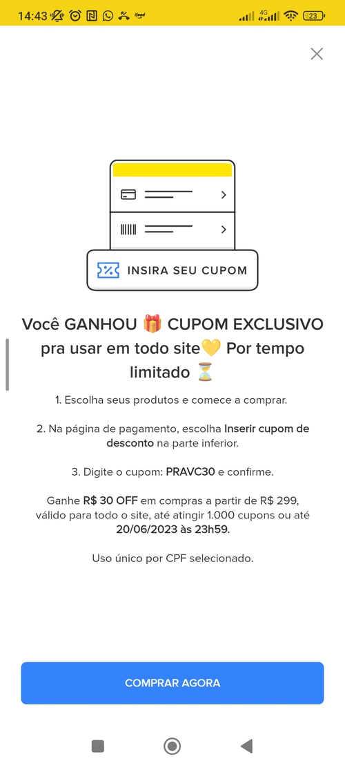 Bem agora estou procurando o cupom, pois o cupom de ontem (GANHEI30) está dando erro, muito obrigado por compartilhar 😊 Deu certo aqui!!!