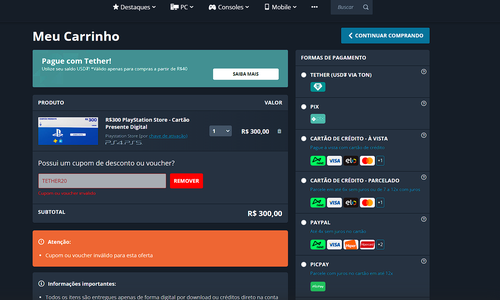 Pessoal não precisa pagar em USDT, faz a compra normal e coloca a forma de pagamento USDT para obter o desconto do cupom, ao finalizar vai aparecer a opção “Sem USDT, compre aqui” ao clicar nesse botão vai gerar um qrcode e um link para pagamento via pix, o desconto é mantido, Stonks!