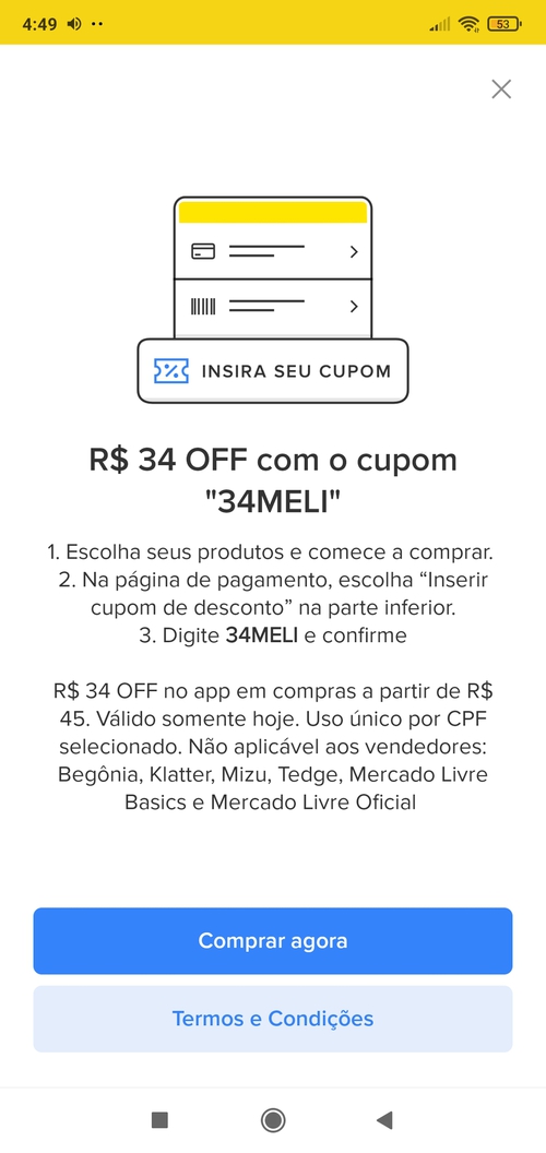 O Merc Livre agora tá com essa fuleragem. A gente recebe a notificação no app do ML, e no mesmo momento vamos fazer a compra, e já dá esgotado, sendo que são 41.000 cupons conforme regulamento. Ninguém consegue usar. Caracteriza-se uma tentativa de lesar o consumidor.