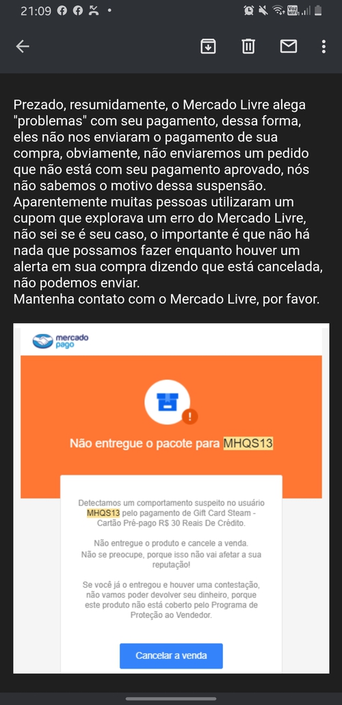 Que beleza, de um lado MercadoLivre me diz que o pagamento está tudo certo e do outro recebo isso.