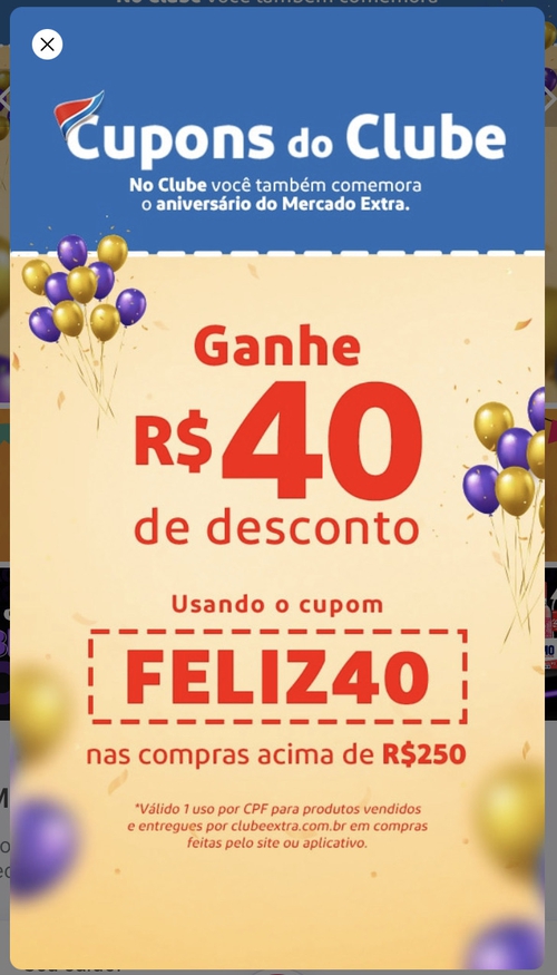 R$40 OFF em compras acima de R$250 no cupom Clube Extra
