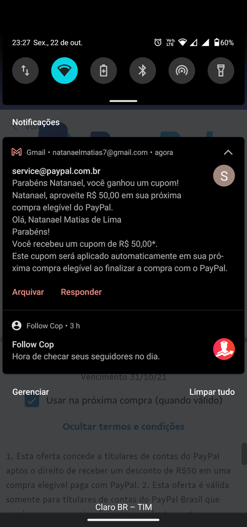Não uso Paypal desde maio. Desinstalei app, tirei como meio de pagamento do Rappi e outros apps/sites e vou deixar no gelo. Eu entendo, como meio de "ser lembrado", que as promoções deles são pra potenciais usuários, que já baixaram, até já usaram mas não usam mais. Só que infelizmente, esse modo de trabalhar deixa os usuários ativos desmotivados. Enquanto eu não receber um e-mail deles pra participar de alguma promo assim, pra mim Paypal não existe mais.
