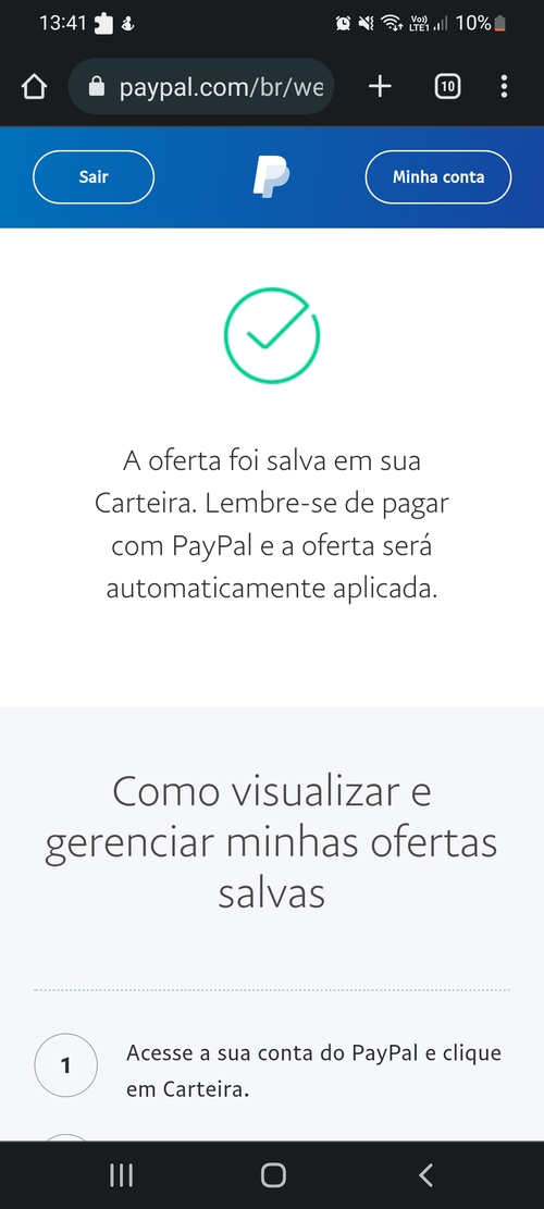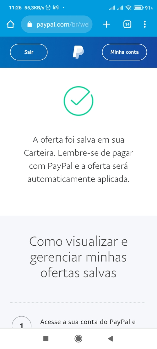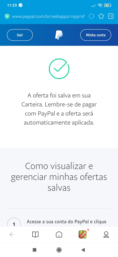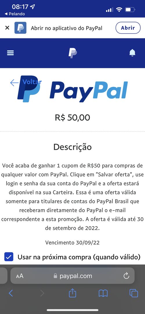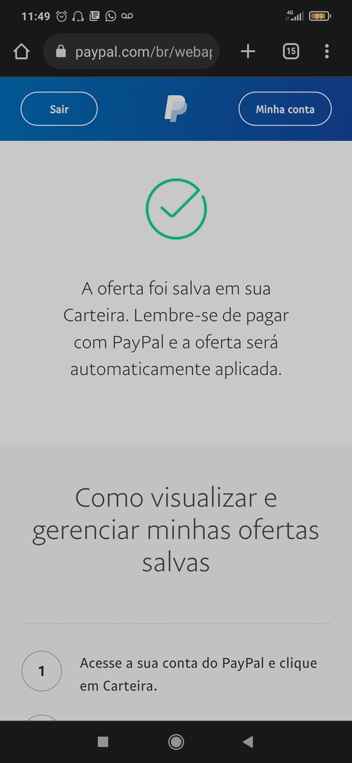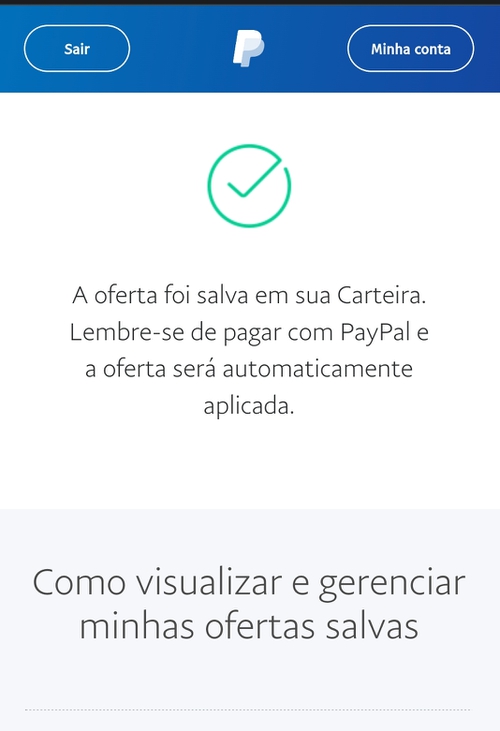 Eu consegui resgatar essa oferta do PayPal eles me mandaram no e-mail O problema é que eu não consigo utilizar o cupom eu faço passo a passo mas quando chega na hora de finalizar a compra não aparece a sugestão de pagar com a oferta