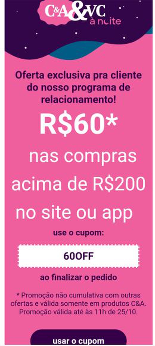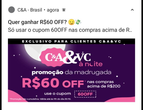 Cupom de desconto C&A para compras acima de R$200 no aplicativo e site, desconto de R$60
