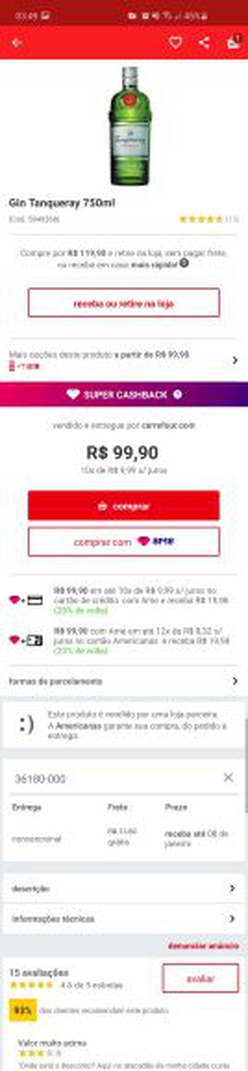 [R$ 68 com AME] Gin Tanqueray 750ml | R$ 85