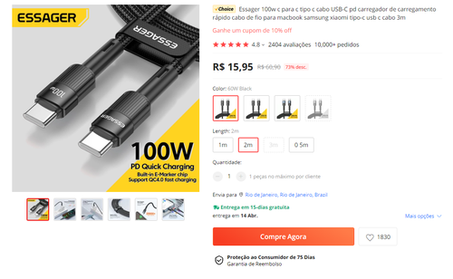 [R$ 8,97 conta nova] Cabo Essager 100w USBc para USBc [2 mts]