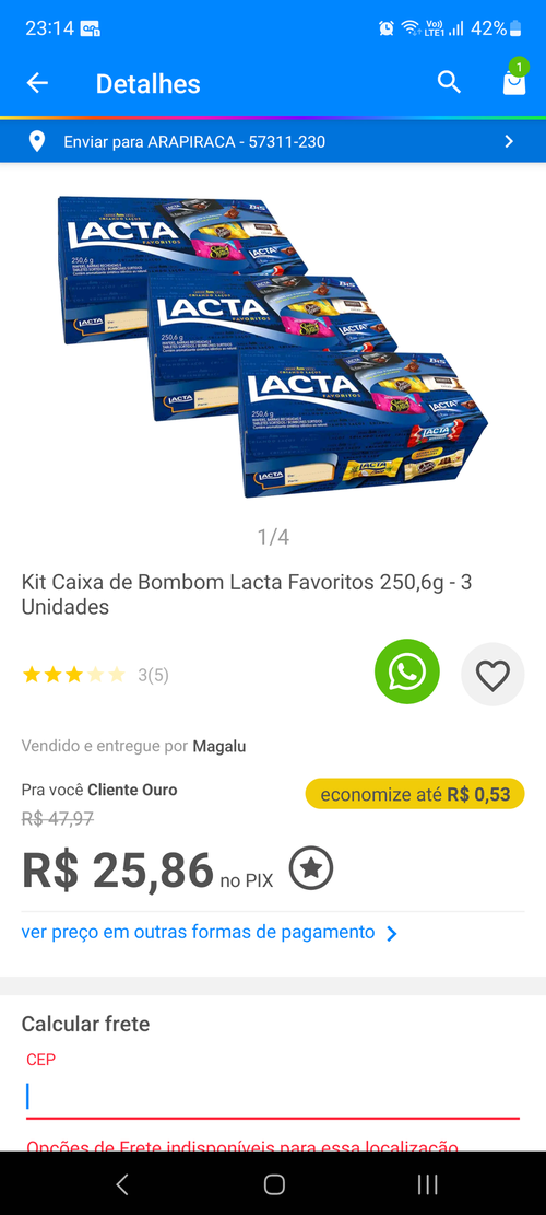 Com o cupom ainda ficou mais barato 😄Testem o cupom para baixar mais... (Não sei se está disponível) lacta15