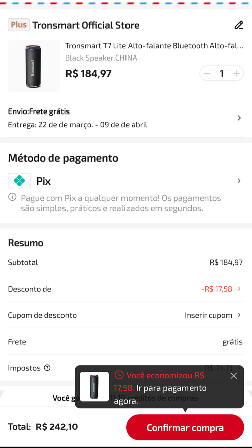 [R$ 188,50 Moedas/APP] Caixa de Som Tronsmart T7 Lite Bluetooth 5.3, IPX7 a prova D'água, 24h Reprodução