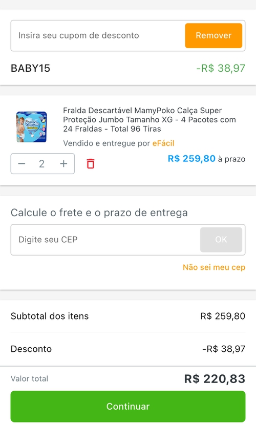 Adicione 2 kits contendo 4 pacotes de 96 fraldas e digite o cupom.