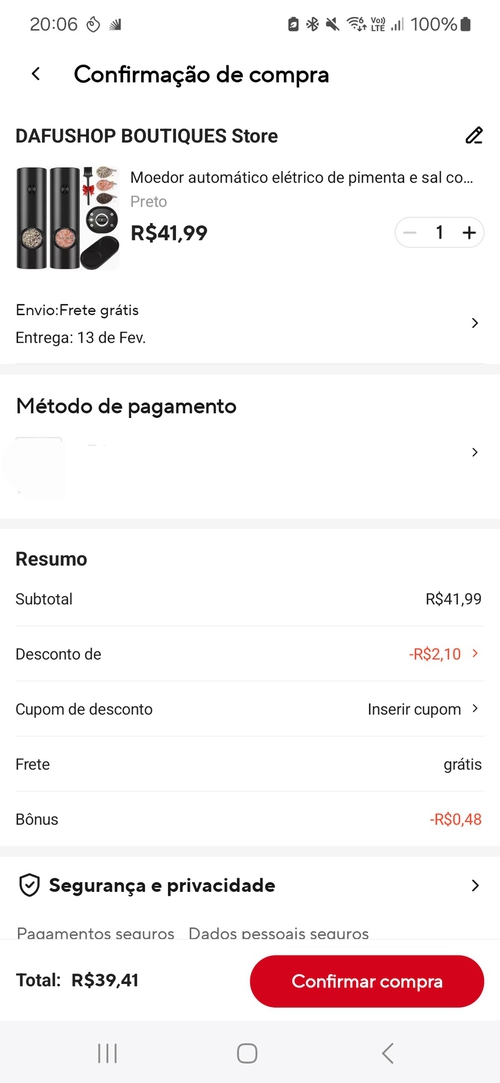 [R$14,70 Moedas/BR] Moedor Automático Elétrico de Pimenta e Sal Com luz led