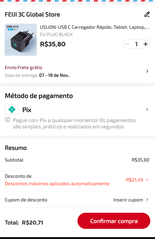 [R$23 Moedas/TxInclusa] USLION-USB C Carregador Rápido 25w U+C, Tablet, Suporte Tipo C PD, Carregador Rápido, Adaptador 3.0