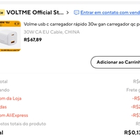 [R$5,94 Moedas/ APP] Voltme Carregador USB C 30w + Cabo 1M ,Gan Carregador Qc Pd 3.0, Carregador De Celulares Smartphone