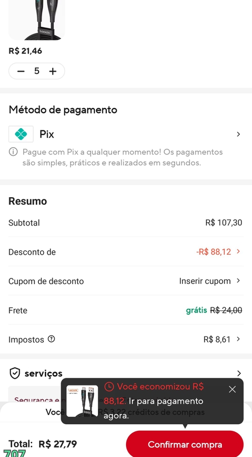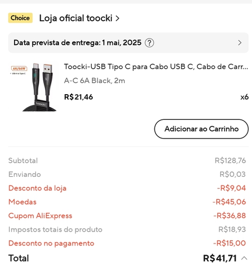 Adicionar 6 unidades no carrinho, resgatar o cupom do vendedor "R$9 reais", pagando cartão visa...