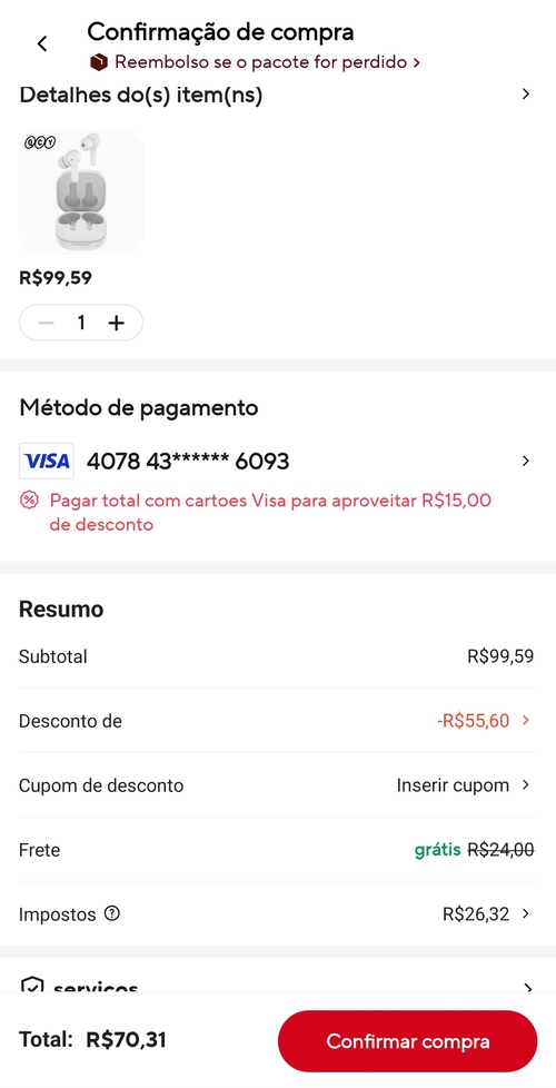 Compre pelo app e pague com cartão Visa para conseguir R$15 de desconto