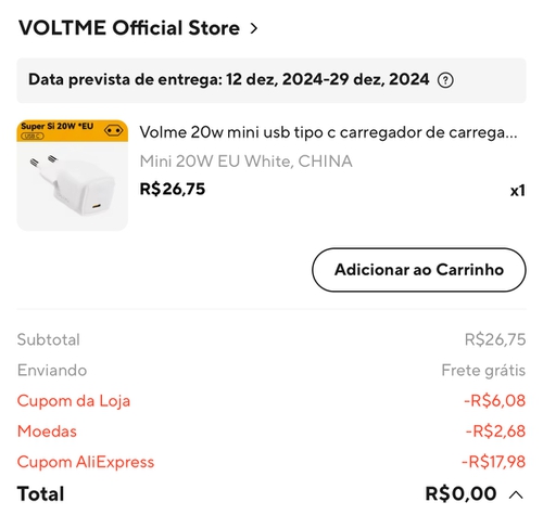 [R$8,51 Moedas|Taxa Inclusa] Carregador 20W USB-C Voltme Mini com Carga Rápida