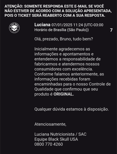 Recebi a resposta sobre o whey questionado, mandei