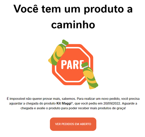 Para realizar um novo pedido, você precisa aguardar a chegada do produto NESCAU Prontinho, que você pediu em 11/01/2022. Aguarde a chegada e avalie o produto para poder receber mais produtos de graça!