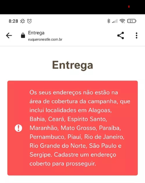 Os seus endereços não estão na área de cobertura da campanha, que inclui localidades em Alagoas, Bahia, Ceará, Espírito Santo, Maranhão, Mato Grosso, Paraíba, Pernambuco, Piauí, Rio de Janeiro, Rio Grande do Norte, São Paulo e Sergipe. Cadastre um endereço coberto para prosseguir