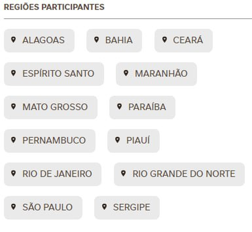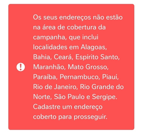 Os seus endereços não estão na área de cobertura da campanha, que inclui localidades em Alagoas, Bahia, Ceará, Espírito Santo, Maranhão, Mato Grosso, Paraíba, Pernambuco, Piauí, Rio de Janeiro, Rio Grande do Norte, São Paulo e Sergipe. Cadastre um endereço coberto para prosseguir.