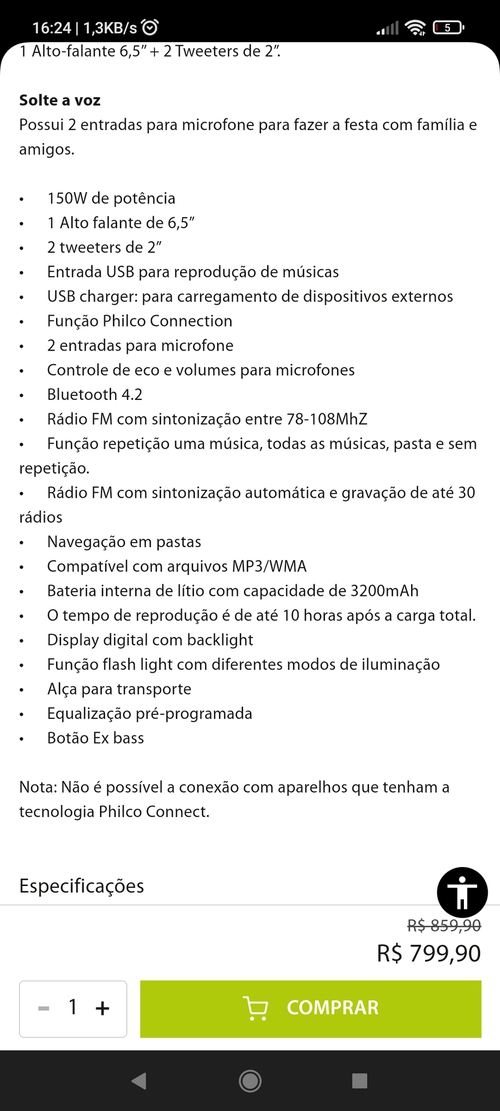 Diz q reproduz 10h com uma bateria de 3200mA.diz 150W mas n diz se é RMS. Enfim, é pra quem tem coragem. Se for pra usar sem fio melhor nem comprar pq vai passar raiva.