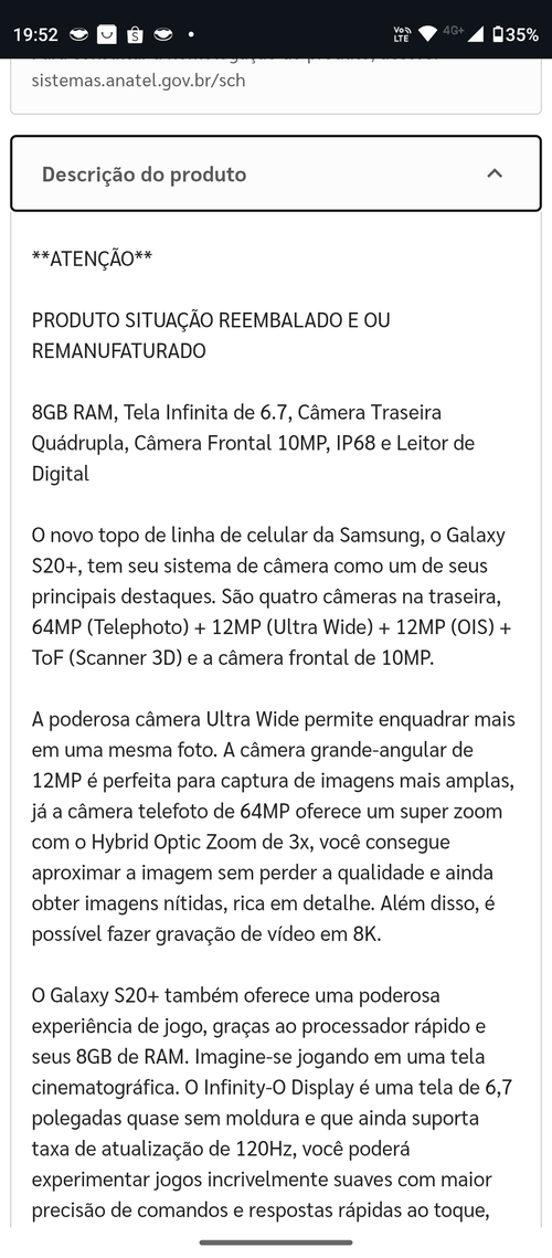 REEMBALADO: Samsung Galaxy S20+ 128GB - Cinza