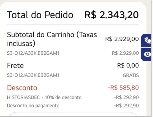 Aqui está ficando 2.636,00 com cupom. O preço normal está 2929,00
