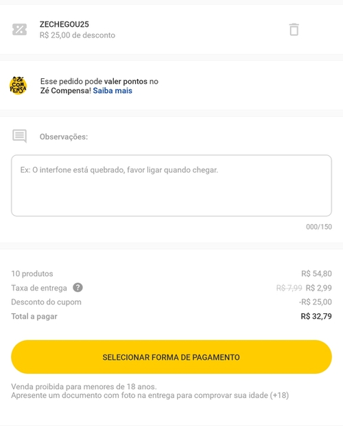Invalido para esse distribuidor. Esse app ta uma porcaria já faz meses. Tu pede e os distribuidores cancelam do nada, tu pede chega tudo quente, isso quando n acontece do cara aceitar teu pedido e deixar la 1 dia em aberto sem entregar e nem nada e depois põe como finalizado, parei de usar aqui onde moro (Guarulhos-SP) pq ta sem condições. Pra quem curte uma heineken peço sempre no echope, também tem outras cervejas, só baixar o app ou pedir pelo navegador mesmo, as x sai o mesmo preço do mercado ou 1 pouco mais em conta, mas chega trincando e os caras enchem de gelo na sacola também pra não ter problema.