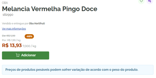 [ REGIONAL ] Melancia Vermelha Pingo Doce R$ 1,99 Kg