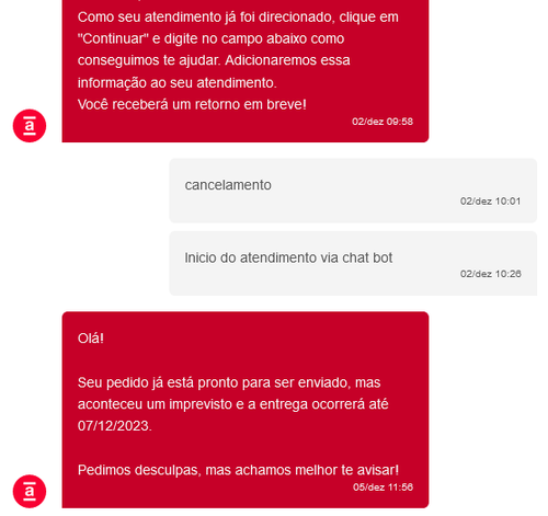 Isto é o que acontece com quem compra com a Americanas.... e ai tem uma tia que diz que não.... 07/12/20203 e não recebi nada até hoje. São tão molequess que eles não colocam nenhum opção para cancelar a compra. Numero de rastreio ? esquece, colocam um numero de não existe, nem nos correios e nem na empresa vagabaa deles. Ai, vc tenta ligar. Se Alguem atender a atendente responde que tem que aguardar.... Aguardar o que ? se nem da para saber aonde esta !