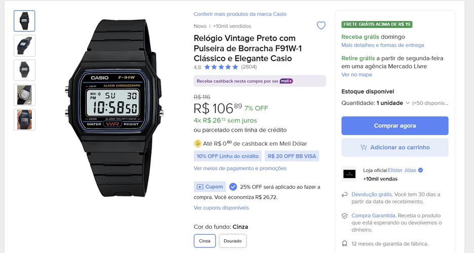 Relógio Vintage Preto com Pulseira de Borracha F91W-1 Clássico e Elegante Casio
