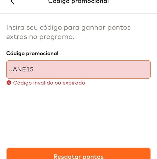No campo “Código Promocional” digite DEZ15 e clique em resgatar os pontos, na sequência aplique o código JANE15 e resgate. Caso os cupons ainda não tenha se esgotado você irá acumular os seus pontos imediatamente.