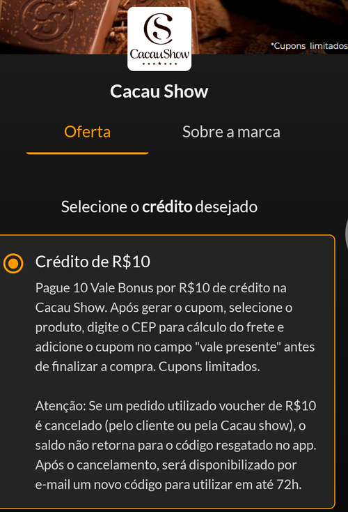 Por curiosidade, fui olhar no app e apareceu pra mim 10 reais pra usar na cacau brasil.