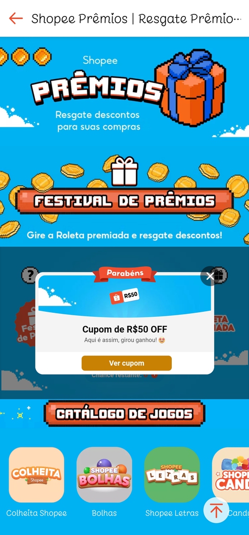 Gire a Roleta Premiada Shopee para resgatar Moedas e Cupons