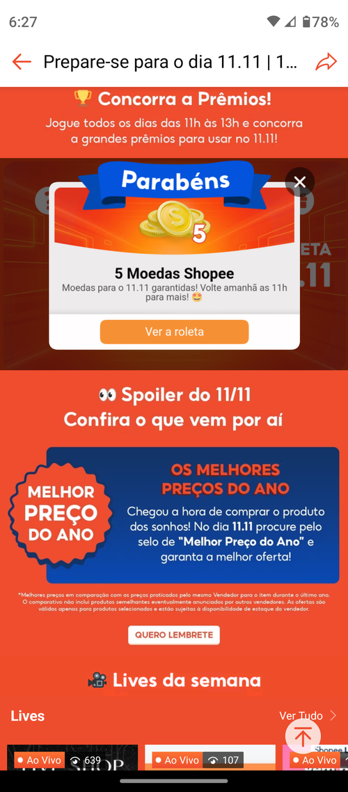 Postem o que vocês ganharam a roleta aparece todo dia, até o 11.11