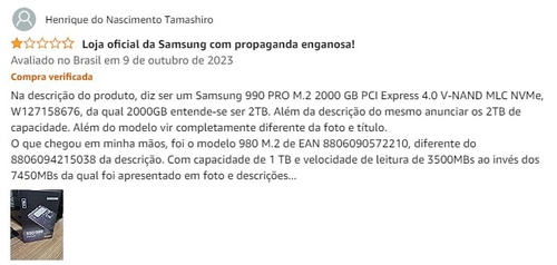 Samsung realmente tá dando calote. Anunciam 990 pro e enviam a 980. Chegou errado pra mim também, reclamei e tiveram a pachorra de dizer que está certo de acordo com a compra. Um absurdo. Já entrei em contato com a Amazon e vou processar a Samsung também.