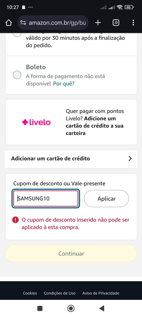 Cupom não pode ser aplicado a esta compra. Pagamento via pix