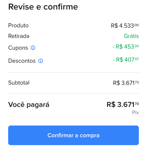 Na etapa do pagamento, selecionando o método "Pix", haverá outro desconto, deixando o aparelho no valor de R$3.671,73.