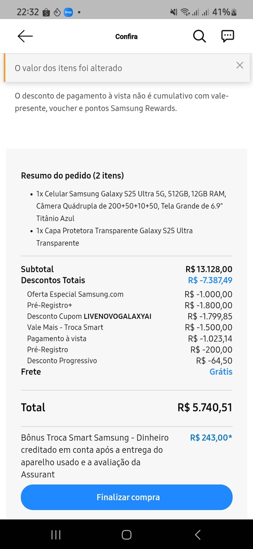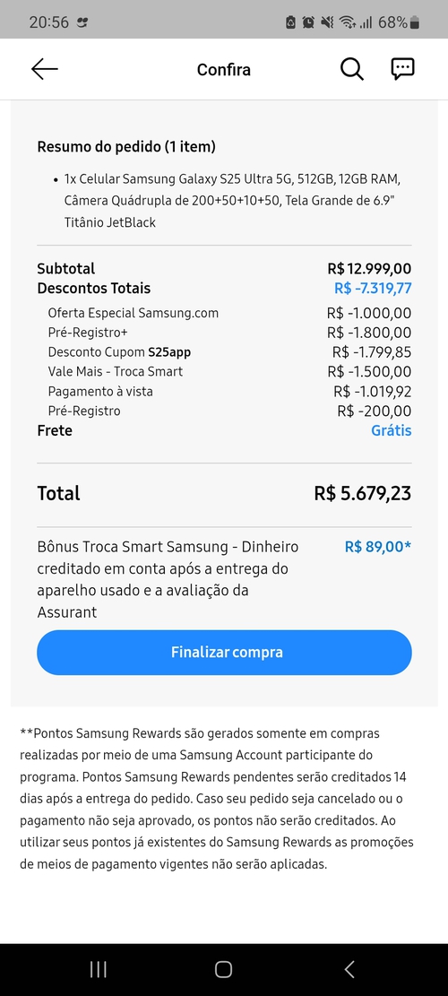 Galera, pra chegar nesse valor eu acredito que tem que adicionar a troca smart e ter o pré registro. No meu caso eu peguei S25+ 512gb por 3800 (fora o k b). Mas eu tirei o print do ultra pra mostrar a vocês como chegar no valor (nesse exemplo foi o S25 ultra de 512gb)