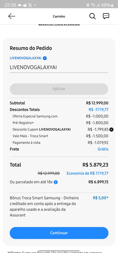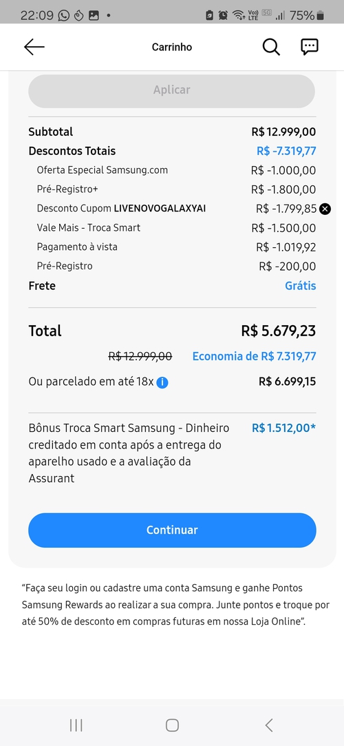 Somente no app. Bônus de 1.500 no troca Smart (coloquei um celular velho)